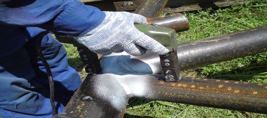 A technician performs MPI on a pipeline to check for stress corrosion cracking using what is known as the "black and white" method. No indications of cracking appear in this picture; the only marks are the 'footprints' of the magnetic yoke and drip marks.